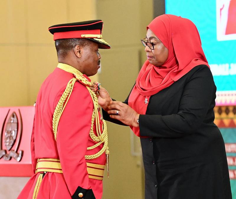 Rais wa Jamhuri ya Muungano wa Tanzania Dkt. Samia Suluhu Hassan akitunuku Nishani ya Miaka 60 ya Jeshi la Ulinzi la Wananchi (JWTZ) Ikulu Dar es Salaam, Agosti 29, 2024.