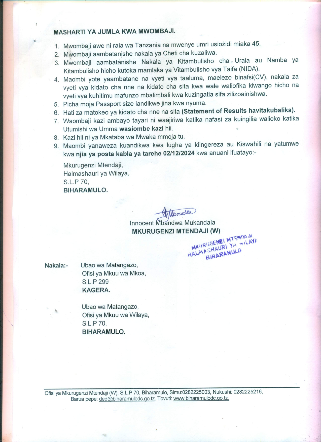 Nafasi Za Kazi Za Mkataba Halmashauri Ya Wilaya Ya Biharamulo Global Publishers November 25, 2024 0 Comments SHARE THIS: amhuri ya Muungano wa Tanzania Ofisi ya Rais Tawala za Mikoa na Serikali za Mitaa Halmashauri ya Wilaya ya Biharamulo. MSUVA AFUNGUKA UGUMU wa MAISHA ya IRAQ, KUISHI MBALI na NYUMBANI, NDOTO ZIMETIMIA KUIPELEKA AFCON? SHARE THIS: