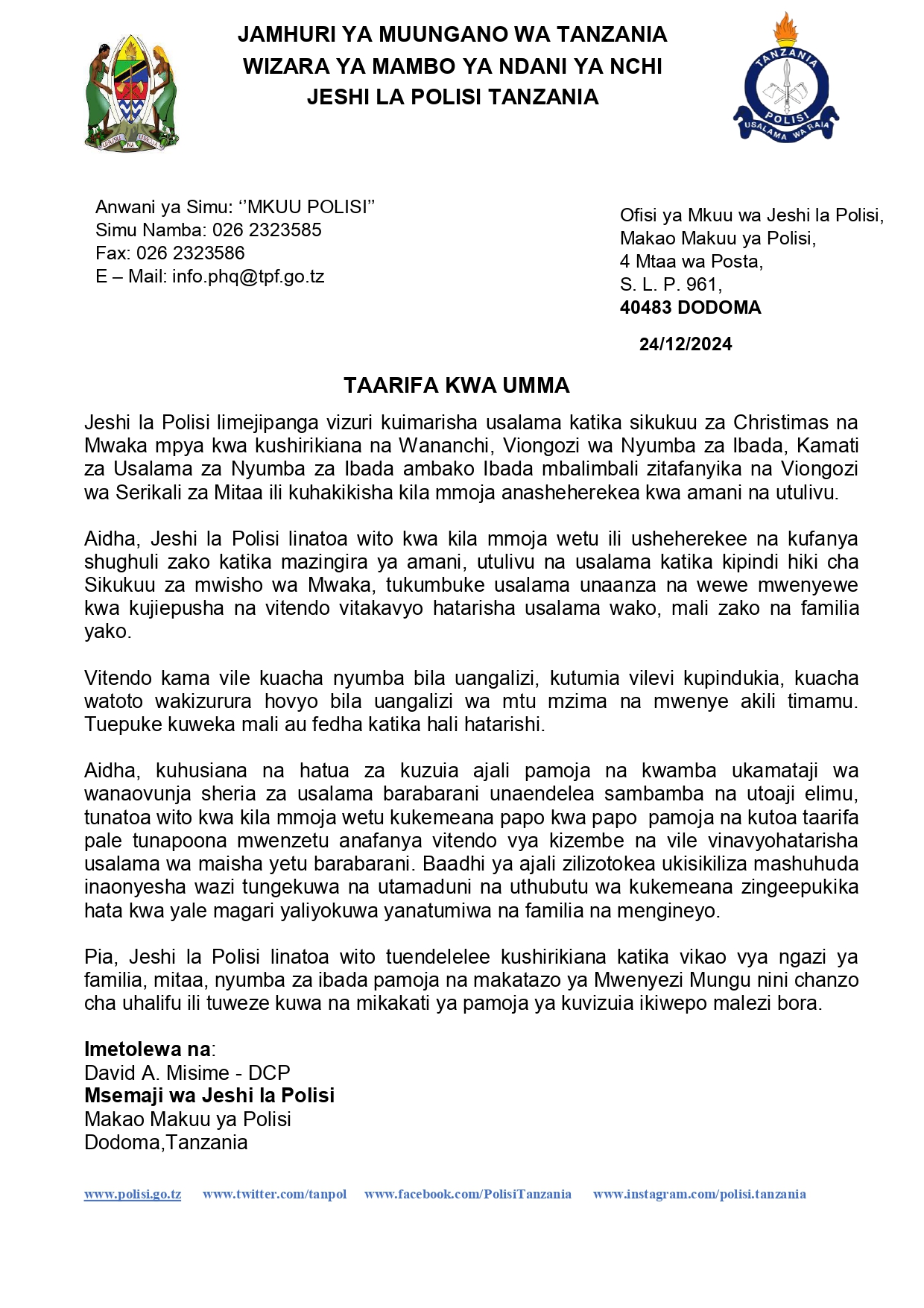 Aidha, Jeshi la Polisi linatoa wito kwa kila mmoja wetu ili usheherekee na kufanya shughuli zako katika mazingira ya amani, utulivu na usalama katika kipindi hiki cha Sikukuu za mwisho wa Mwaka, tukumbuke usalama unaanza na wewe mwenyewe kwa kujiepusha na vitendo vitakavyo hatarisha usalama wako, mali zako na familia yako.