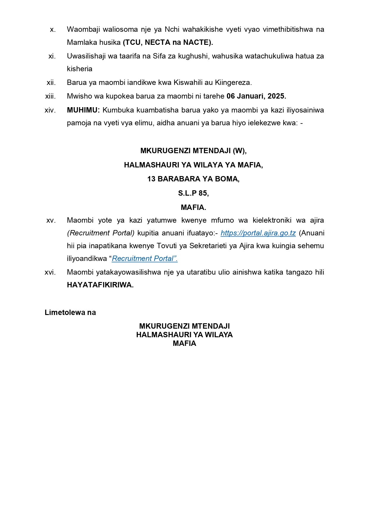 Mkurugenzi Mtendaji wa Halmashuri ya Wilaya ya Mafia amepokea Kibali cha Ajira Mpya kwa Ikama ya Mwaka wa Fedha 2023/2024 kutoka kwa Katibu Mkuu, Ofisi ya Rais, Menejimenti ya Utumishi wa Umma na Utawala Bora chenye Kumb. Na. FA.97/288/01/09 cha tarehe 25 Juni, 2024 kwa upande wa nafasi za Msaidizi wa