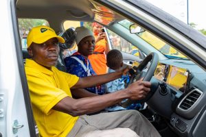 Ibrahim Njeja, mkulima kutoka Manyara, akipiga picha na mke wake baada ya kupokea gari aina ya Kia Seltos aliloshinda katika kampeni ya “Magift ya Kugift” huko Msitu wa Tembo, Manyara.