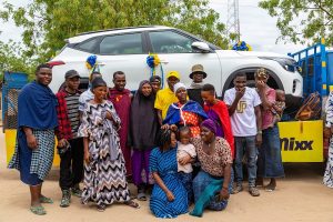 Ibrahim akiwa na ndugu na jamaa zake kwenye pozi na gari baada ya kukabidhiwa.