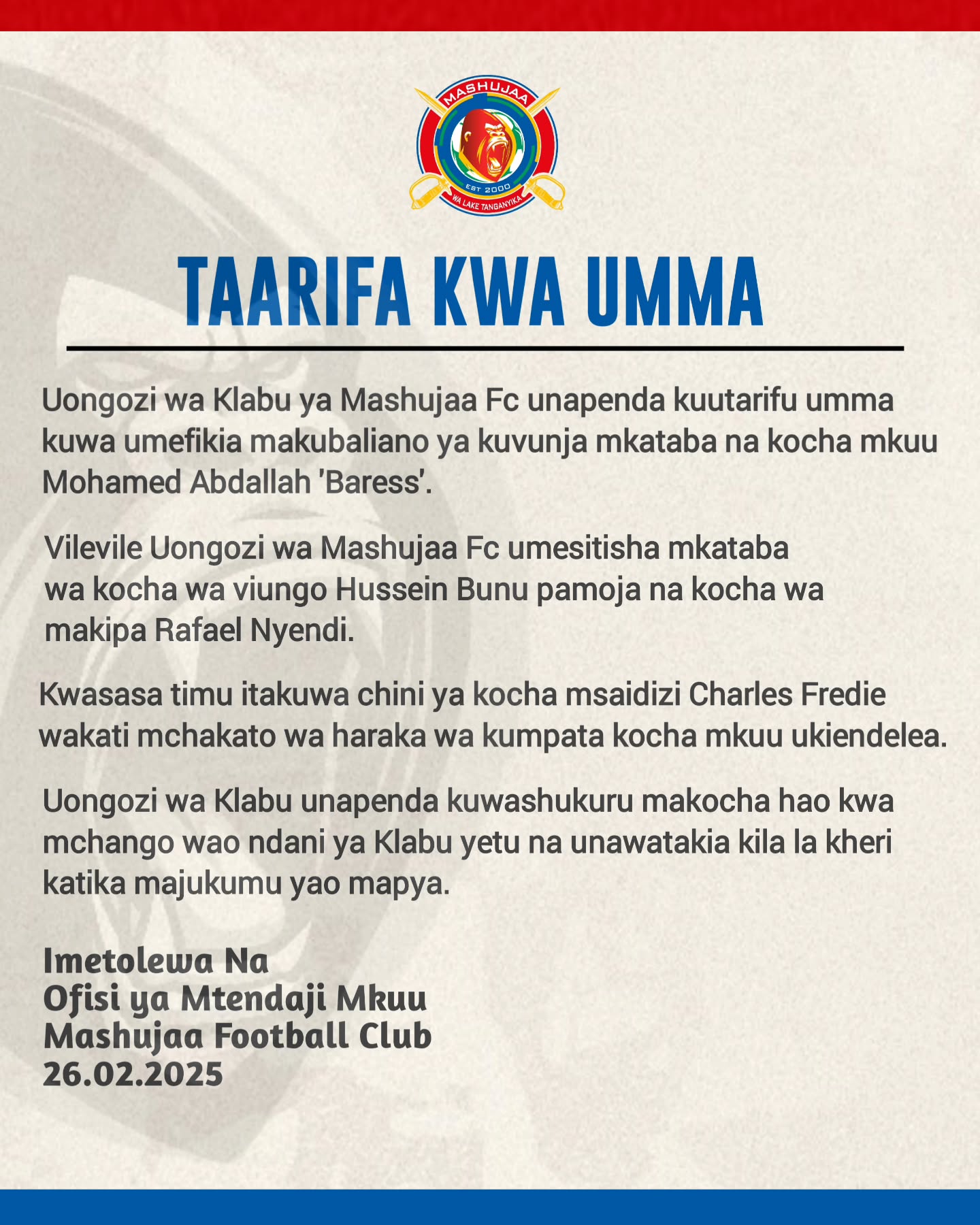 Klabu ya Mashujaa Fc imethibitisha kumfuta kazi kocha mkuu Mohamed Abdallah ‘Baress’ baada ya kufikia makubaliano ya kuvunja mkataba na kocha huyo kufuatia mwenendo usioridhisha wa klabu hiyo vikiwemo vipigo viwili mfululizo dhidi ya Yanga Sc (5-0) na Singida Black Stars (3-0)