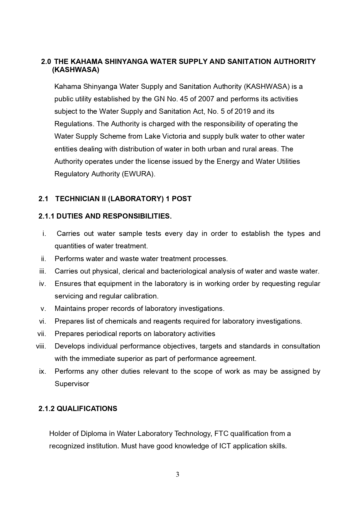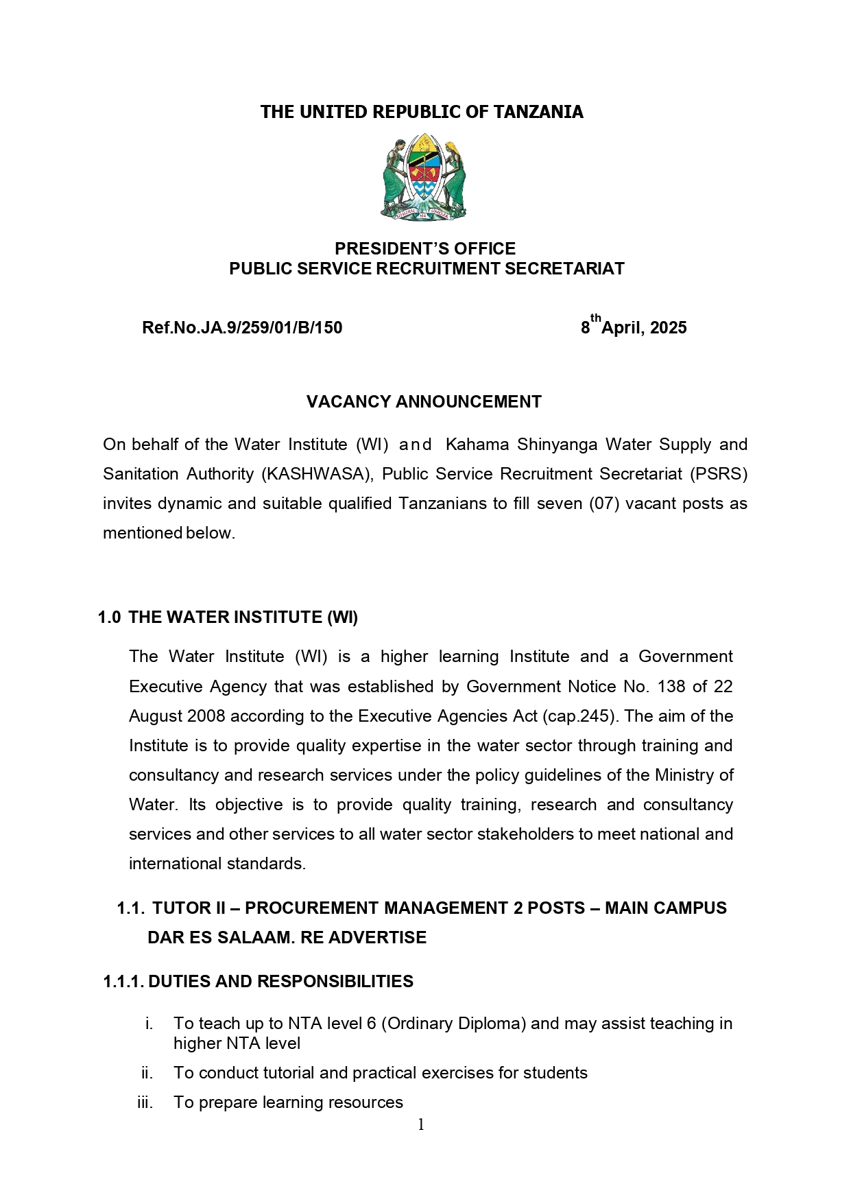 Taasisi ya Maji (WI) na Mamlaka ya Majisafi na Usafi wa Mazingira Kahama Shinyanga (KASHWASA), kupitia Sekretarieti ya Ajira katika Utumishi wa Umma (PSRS), wanakaribisha Watanzania wenye sifa, weledi, na nia ya dhati kuomba nafasi saba (7) za ajira kama zilivyoainishwa hapa chini.