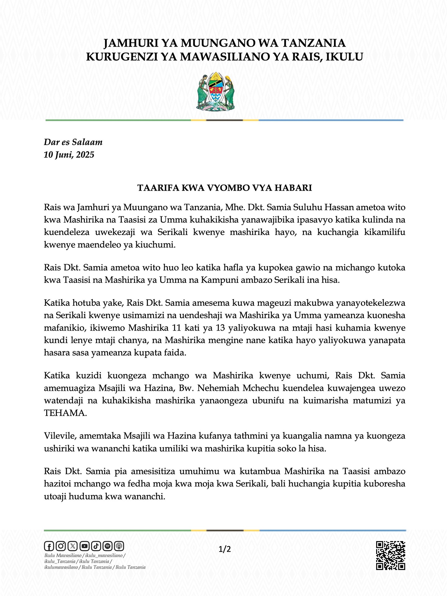 Rais wa Jamhuri ya Muungano wa Tanzania Dkt. Samia Suluhu Hassan ameshiriki hafla ya kupokea Gawio na michango kutoka kwa Tasisi na Mashirika ya Umma Ikulu Dar es salaam, leo tarehe 10 Juni, 2025.