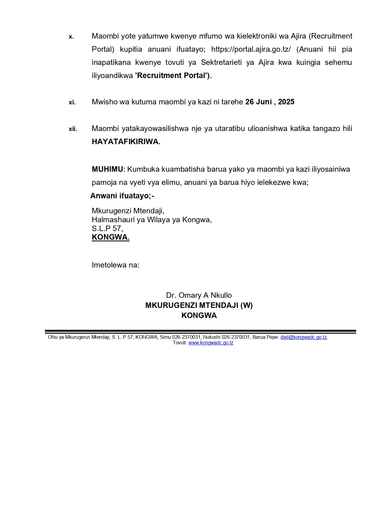 Mkurugenzi Mtendaji wa Halmashauri ya Wilaya ya Kongwa kufuatia kupokea kibali cha ajira mpya chenye Kumb. Na.FA.87/97/01/99 cha tarehe 15 Mei, 2025 kutoka kwa Katibu Mkuu, Ofisi ya Rais, Menejimenti ya Utumishi wa Umma na Utawala Bora anawatangazia watanzania wote wenye sifa na nia ya kufanya kazi katika Halmashauri ya