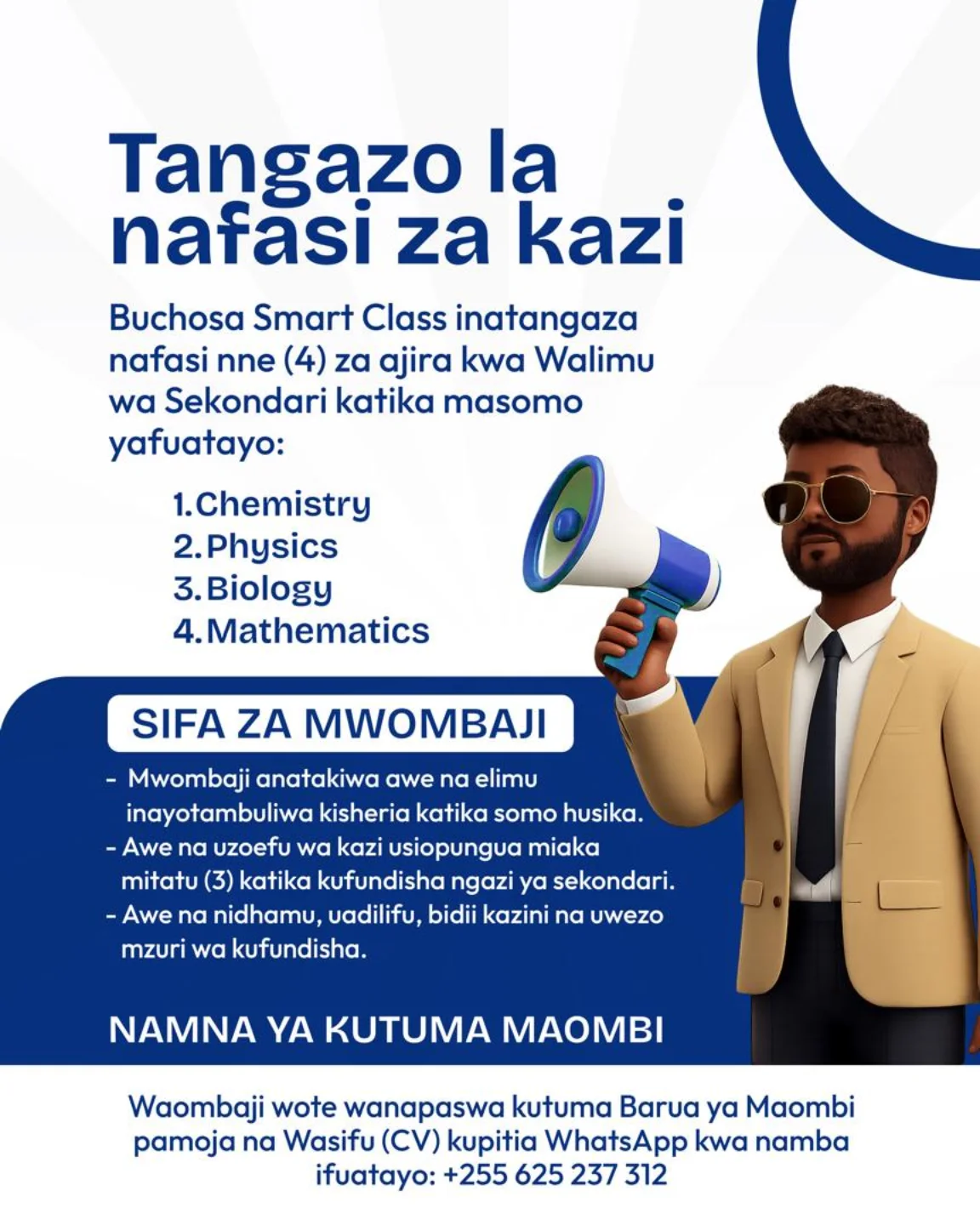 Buchosa Smart Class inatangaza nafasi nne (4) za ajira kwa walimu wa Sekondari katika masomo yafuatayo: