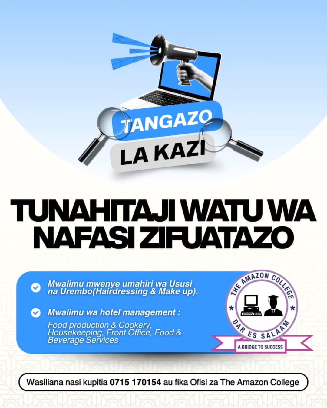 Wasiliana kupitia 📞 0715 170154 au fika Ofisi za The Amazon College.