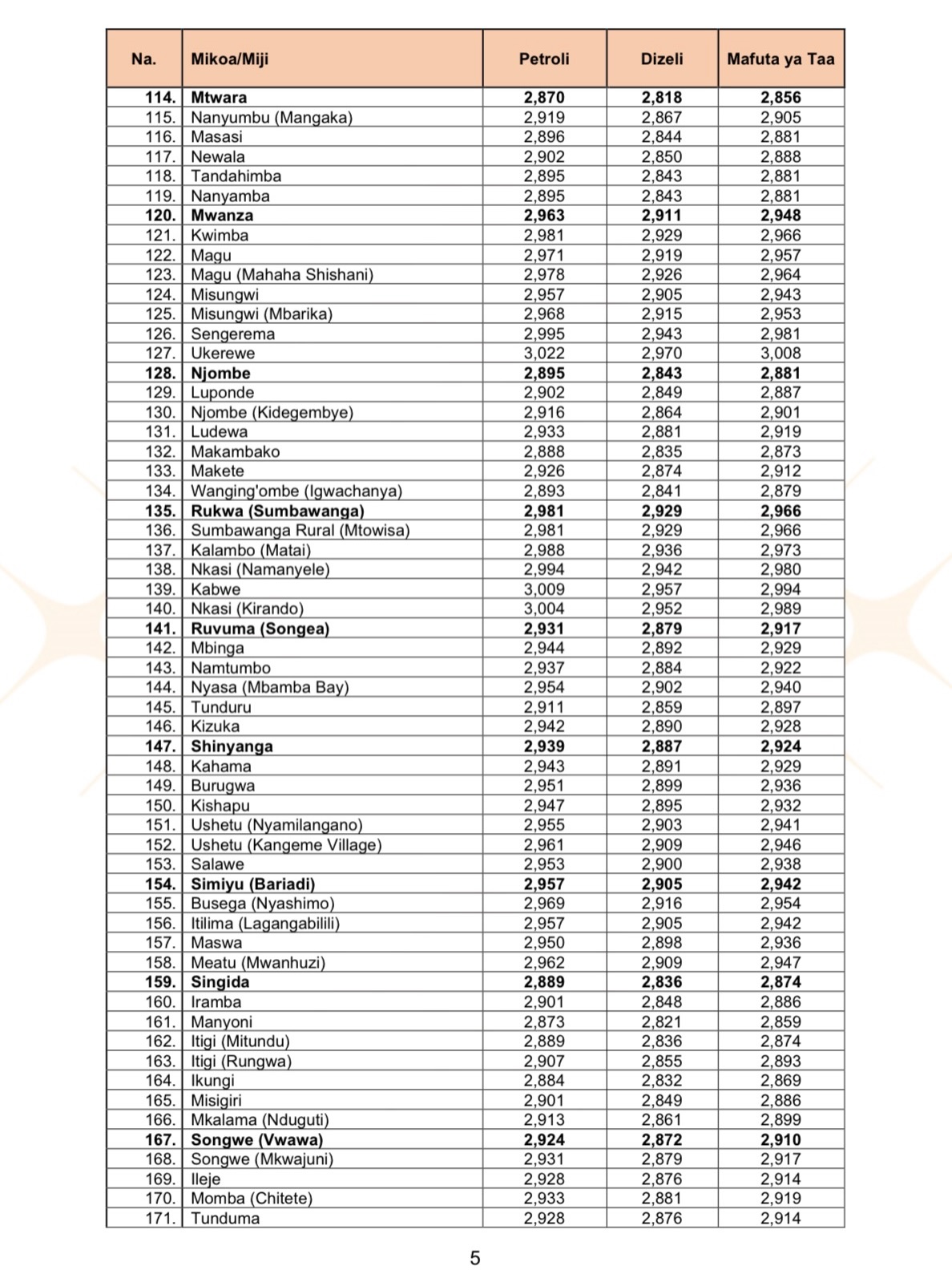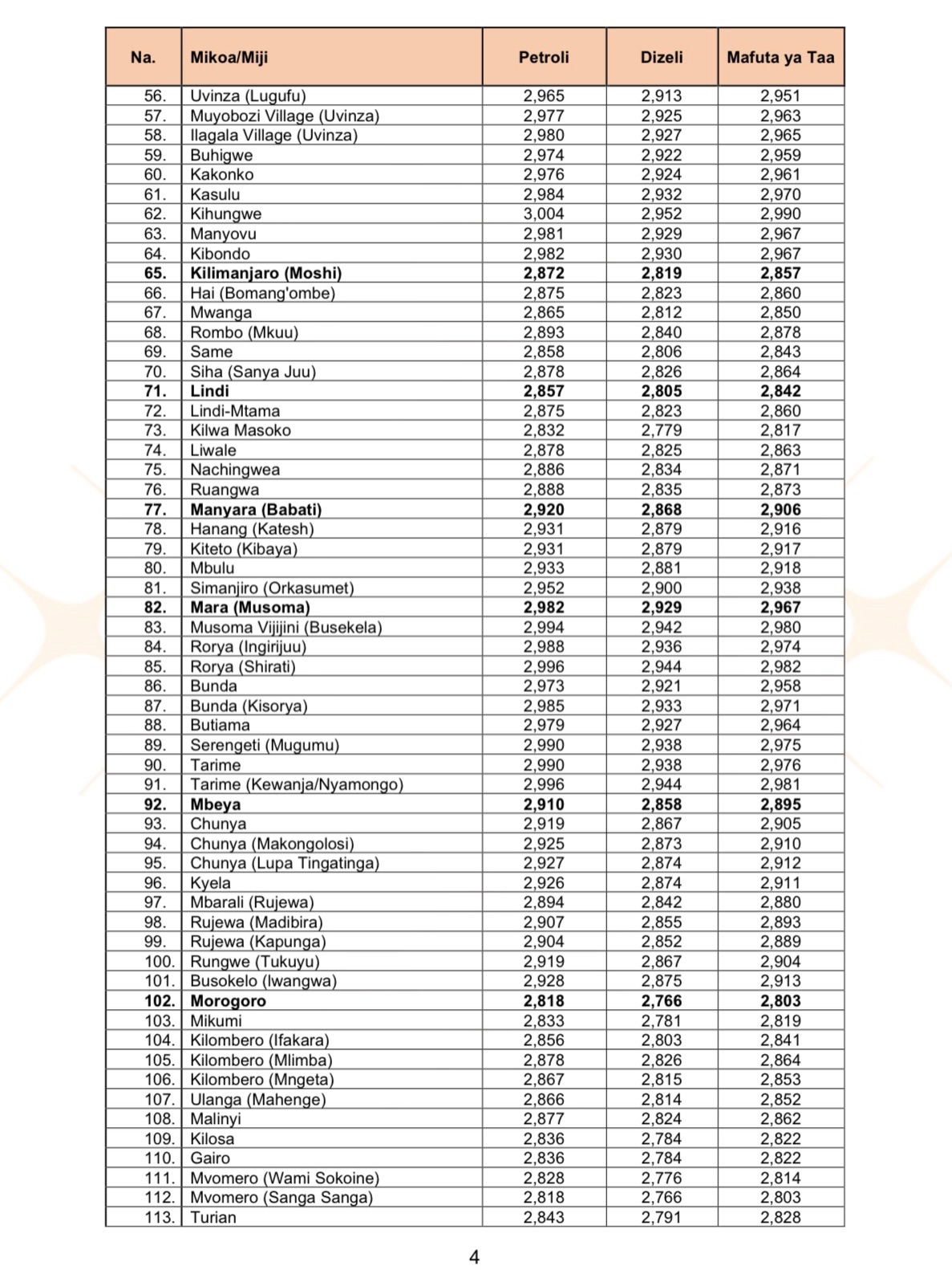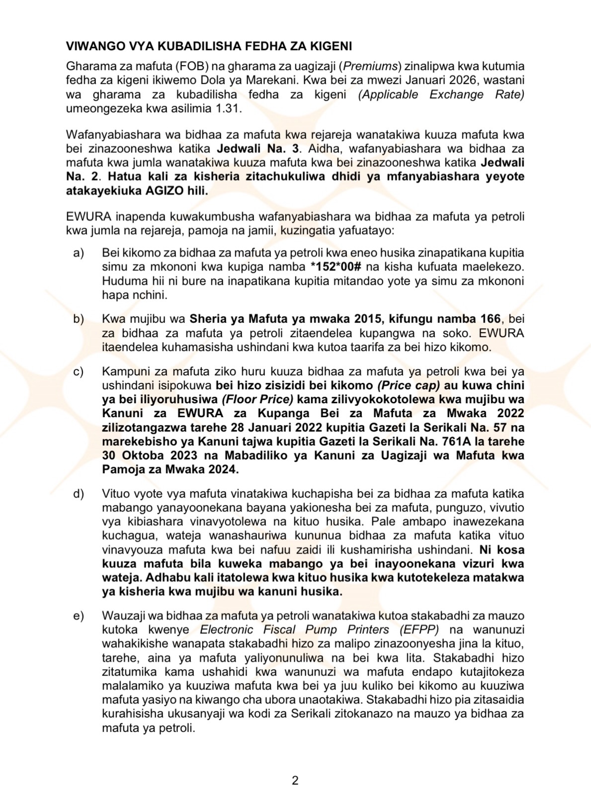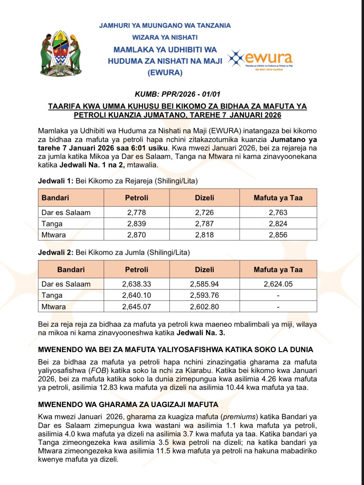 Dar es Salaam, Januari 7, 2026 – Mamlaka ya Udhibiti wa Huduma za Nishati na Maji (EWURA) imetangaza bei kikomo mpya za bidhaa za mafuta ya petroli, dizeli na mafuta ya taa zitakazoanza kutumika nchini kuanzia leo Jumatano, zikionesha mabadiliko mbalimbali kulingana na bandari na aina ya bidhaa.