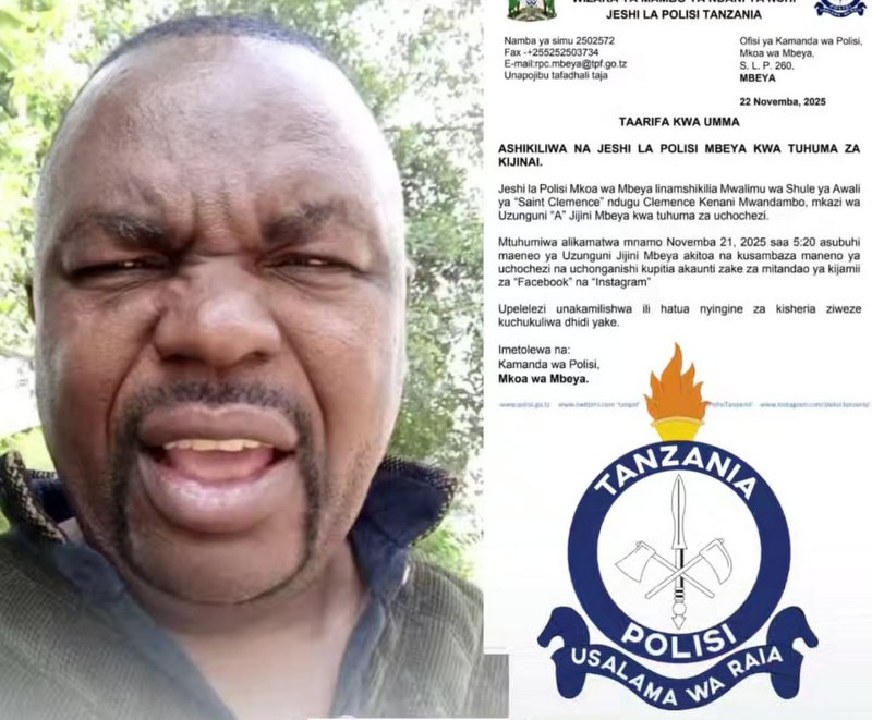 Jeshi la Polisi Mkoa wa Mbeya limemkamata mwalimu wa shule ya awali Saint Clemence, Clemence Kenani Mwandambo, kwa tuhuma za kusambaza maneno ya uchochezi kupitia kurasa zake za mitandao ya kijamii.