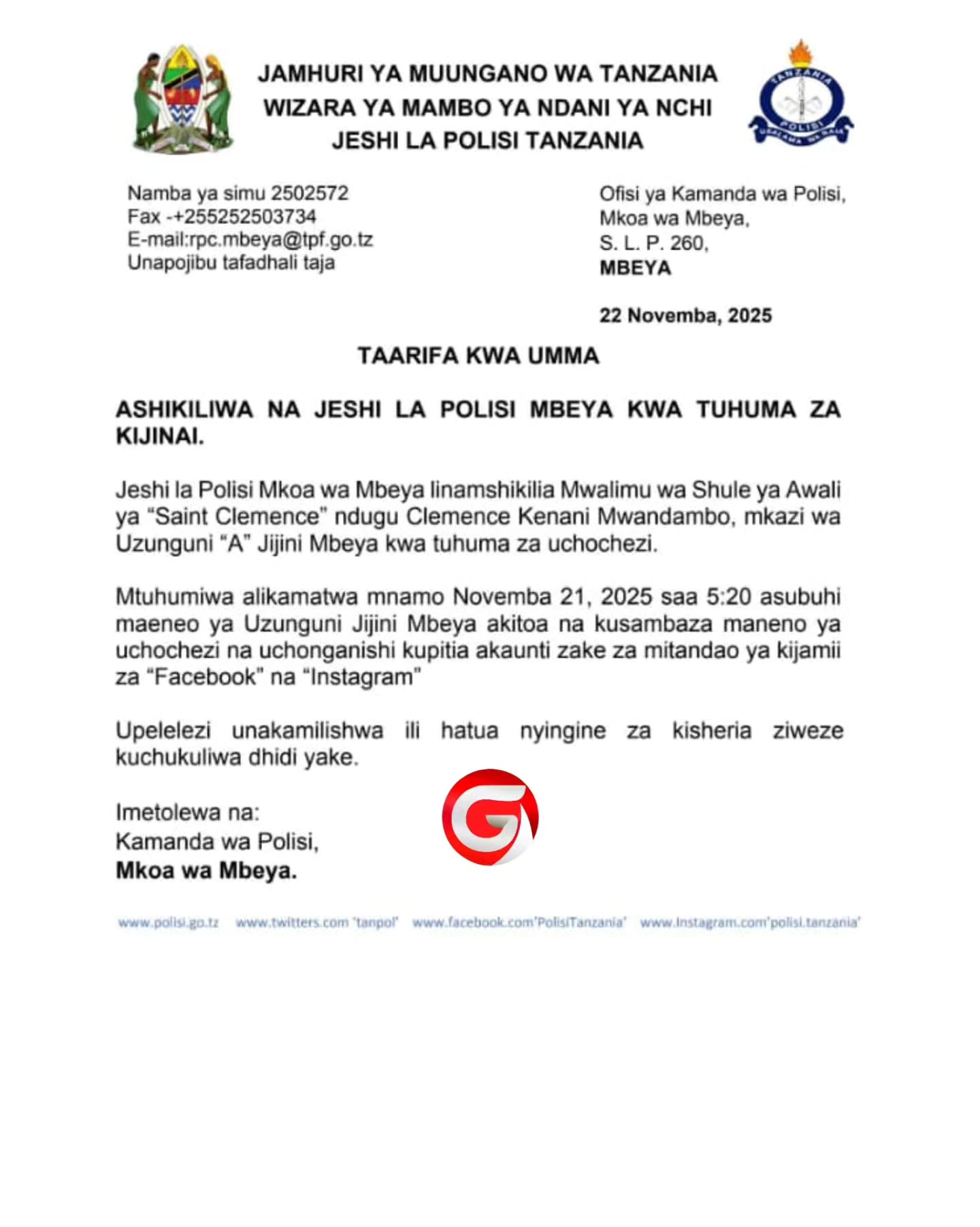 Kwa mujibu wa taarifa rasmi iliyotolewa na ofisi ya Kamanda wa Polisi, mtuhumuwa alikamatwa tarehe 21 Novemba 2025 saa 5:20 asubuhi katika eneo la Uzunquni “A”, Jiji la Mbeya, mara baada ya polisi kupokea taarifa kwamba alikuwa akituma na kusambaza ujumbe wenye ubishani na uchochezi kupitia akaunti zake za Facebook na Instagram.