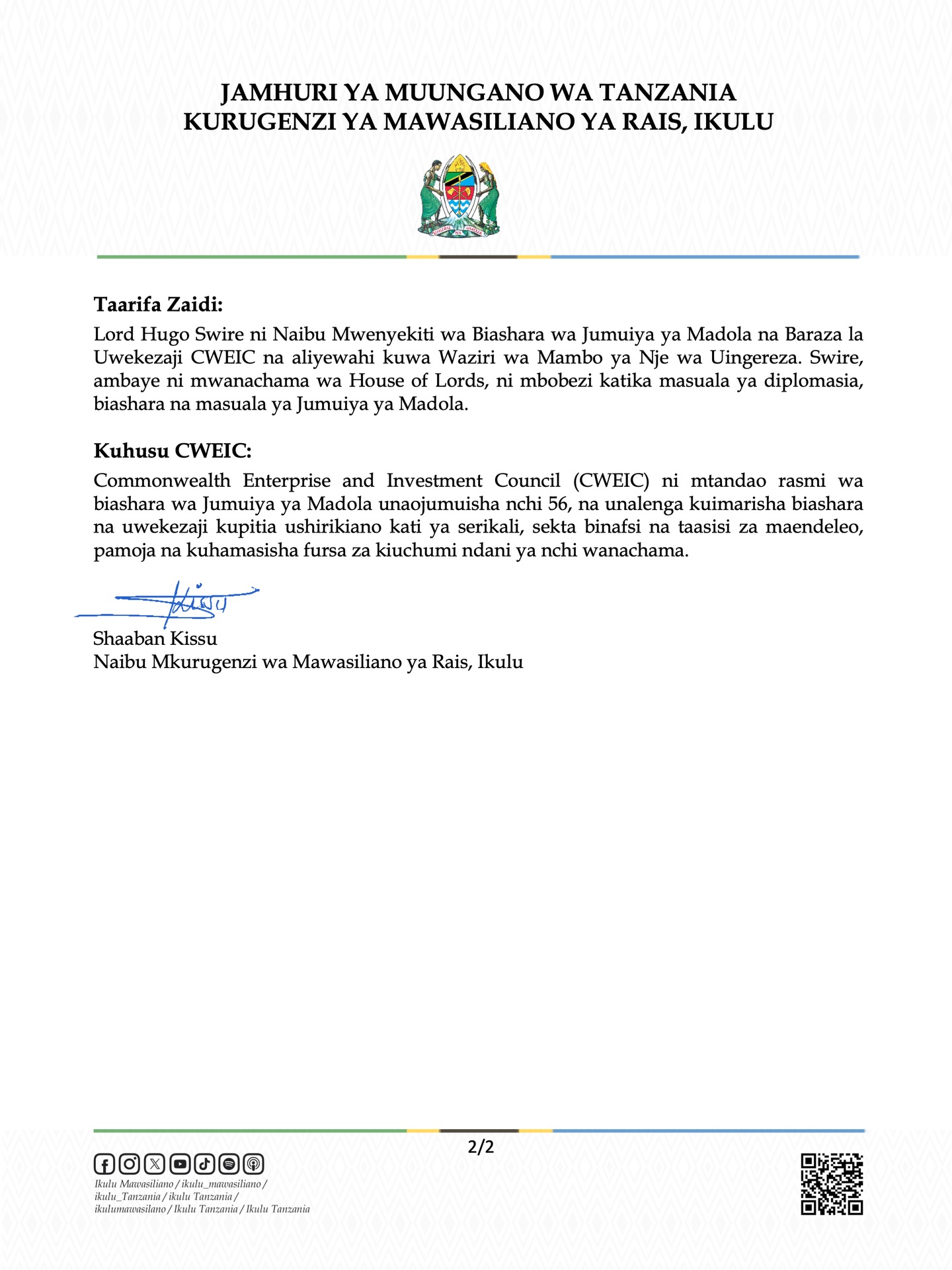 Rais wa Jamhuri ya Muungano wa Tanzania, Mhe. Dkt. Samia Suluhu Hassan, amekutana na kufanya mazungumzo na Naibu Mwenyekiti wa Biashara ya Jumuiya ya Madola na Baraza la Uwekezaji (CWEIC), Mhe. Lord Hugo Swire, Ikulu Jijini Dar es Salaam, tarehe 02 Desemba 2025.