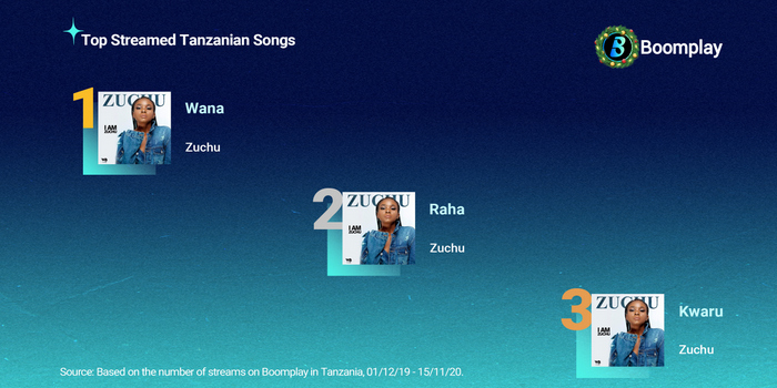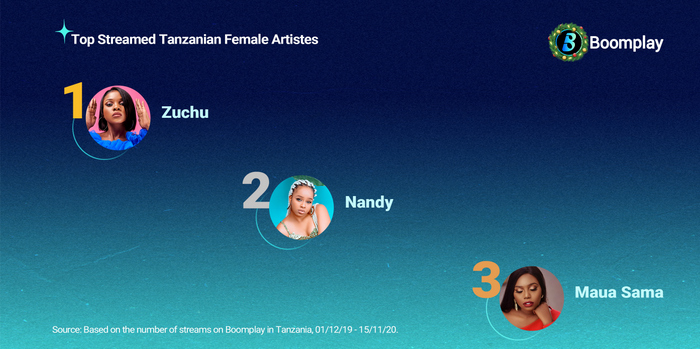 Wasanii wa kike watatu wa kwanza nchini Tanzania waliosikilizwa zaidi ni Zuchu akishika nafasi ya kwanza akifuatiwa na Nandy katika nafasi ya pili huku Maua Sama akishika nafasi ya tatu. Zuchu pia ametawala katika kipengele cha Nyimbo tatu kutoka kwa wasanii wa Tanzania zilizoongoza kusikilizwa ambazo ni Wana, Raha na Kwaru, zote hizo kutoka kwenye albamu ya Zuchu ‘I am Zuchu’.