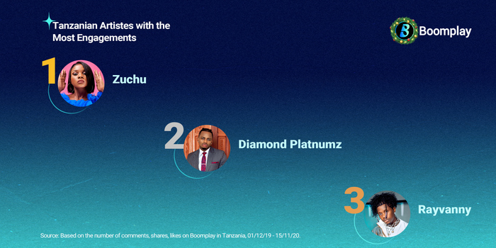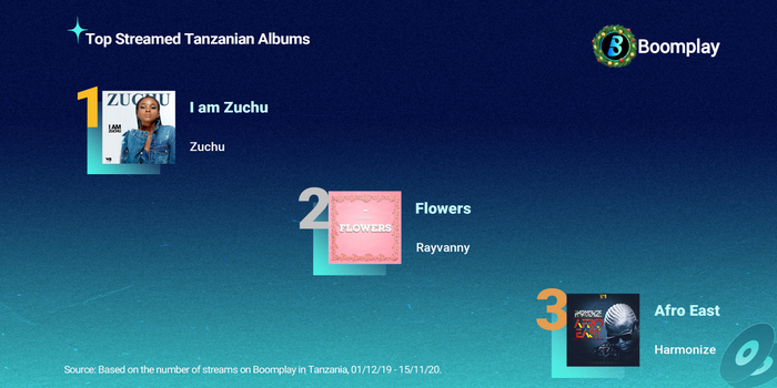 App namba moja kwa huduma ya muziki Barani Afrika, Boomplay imemtaja msanii Rayvanny kuwa ndiyo mwanamuziki wa kiume aliyesikilizwa zaidi Tanzania huku Zuchu akiwa ndiyo mwanamuziki wa kike aliyesikilizwa zaidi Tanzania. Hii ni kwa mujibu wa taarifa na takwimu rasmi za muziki kwa mwaka 2020.