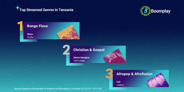 Boomplay pia imetoa taarifa za mwenendo na tabia za namna muziki unavyosikilizwa Tanzania. Katika taarifa hiyo maalumu, Bongo Flava imeongoza kwa kusikilizwa ikifuatiwa na nyimbo za Injili (Gospel) huku Afropop & Afrofusion ikishika namba tatu.