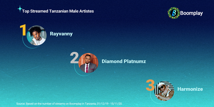 Kwa kuanza na wasanii wa kiume watatu wa kwanza waliosikilizwa zaidi nchini Tanzania, Rayvanny anashika nafasi ya kwanza akifuatiwa na Diamond Platnumz katika nafasi ya pili huku Harmonize akishika nafasi ya tatu.