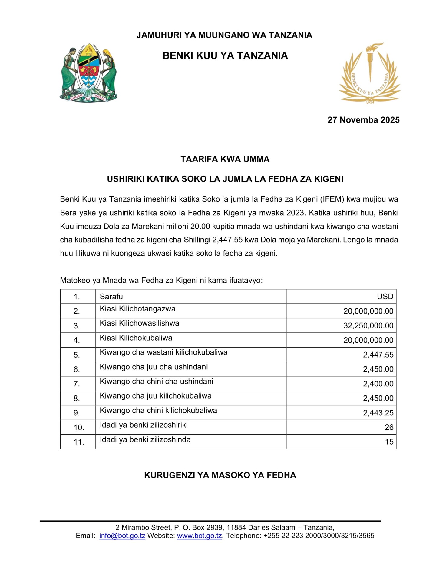 Benki Kuu imeuza Dola za Marekani milioni 20.00 kupitia mnada wa ushindani kwa kiwango cha wastani cha kubadilisha fedha za kigeni cha Shillingi 2,447.55 kwa Dola moja ya Marekani. Lengo la mnada huu lilikuwa ni kuongeza ukwasi katika soko la fedha za kigeni.”