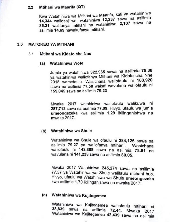 BARAZA la Mitihani Tanzania (Necta) leo limetangaza matokeo ya kidato cha nne mwaka 2018 ambapo ufaulu umeongezeka kwa asilimia 1.29 kutoka asilimia 77.09 mwaka 2017 hadi asilimia 78.38.