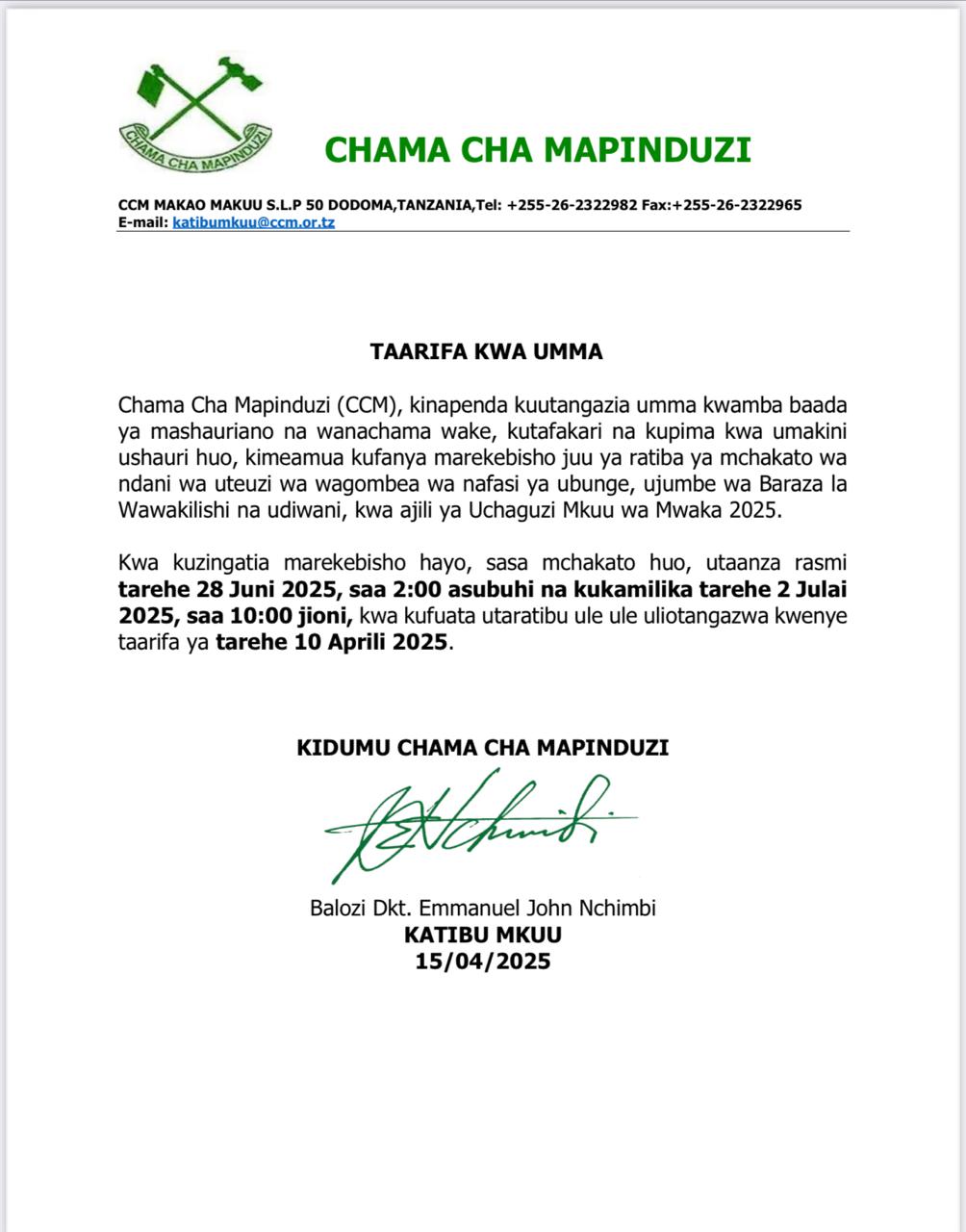 Chama Cha Mapinduzi (CCM) kimefanya marekebisho juu ya ratiba ya mchakato wa ndani wa uteuzi wa wagombea wa nafasi ya ubunge, ujumbe wa Baraza la wawakilishi na udiwani, kwa ajili ya Uchaguzi Mkuu wa Mwaka 2025.
