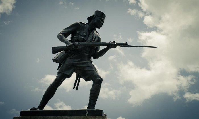 Sanamu inamwonyesha askari Mwafrika katika sare ya kijeshi ya wakati wa Vita Kuu ya Kwanza ya Dunia (1914-1918) akishika bunduki yenye kisu cha kando na kutazama upande wa bahari.