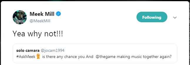 Kwa upande wa Meek Mill alionyesha kuwa wapo sawa na The Game baada ya shabiki katika akaunti ya tweeter kuandika kwamba ‘kuna uwezekano kati yako na Game kufanya muziki?’ Meek akajibu kwa kuandika, “Ndiyo kwa nini isiwezekane”