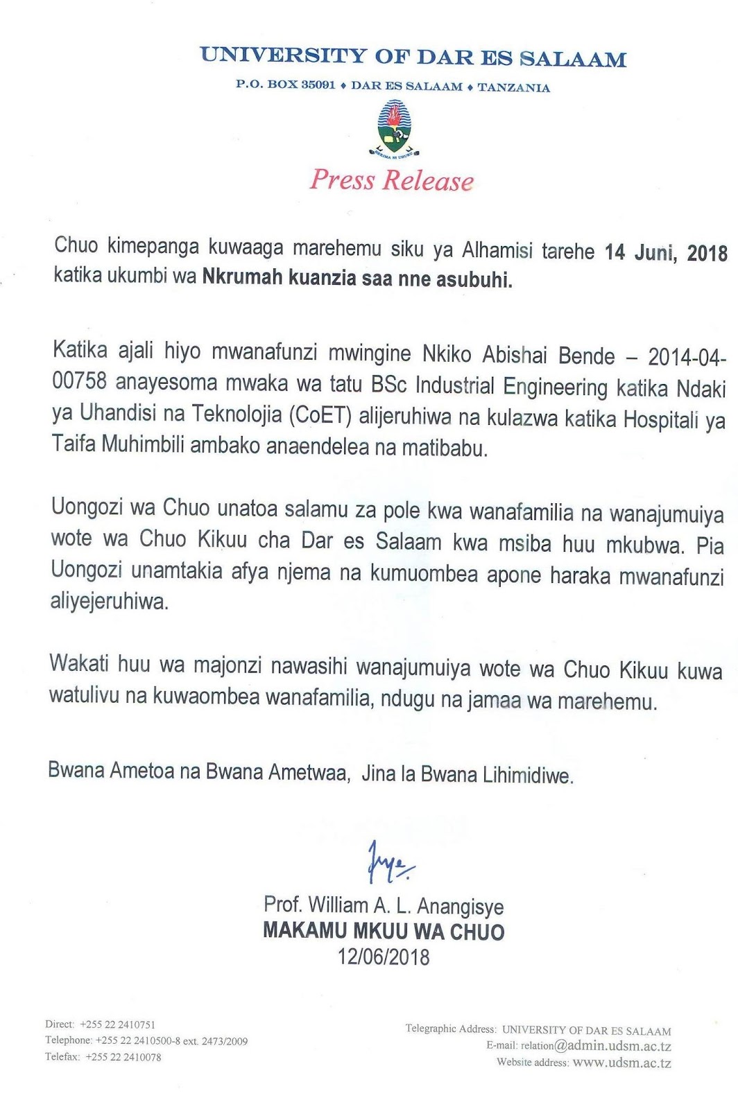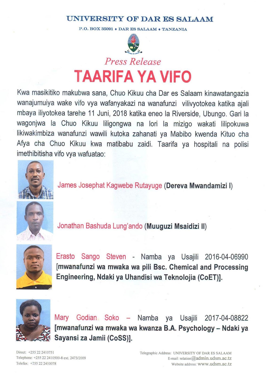 HabariKitaifa Kauli ya UDSM Wanafunzi na Wafanyakazi Wake Kufariki Ajali On Jun 13, 2018 Share Related ajaliudsm Share