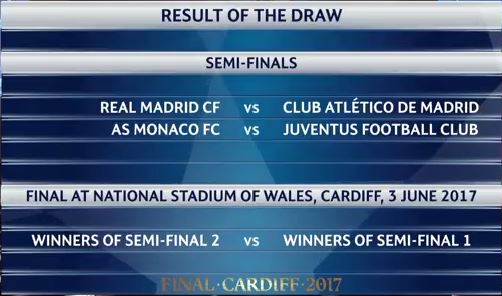 HabariMichezo VIDEO: Matokeo ya Droo Nusu Fainali ya Ligi ya Mabingwa Ulaya Last updated Apr 21, 2017 0 Share #UCLdraw #ChampionsLeague Matokeo ya droo nusu fainali ya Ligi ya Mabingwa Ulaya. 1. Real Madrid v Atletico Madrid 2. Monaco v Juventus TAZAMA DROO HIYO ILIVYOCHEZESHWA. Related CHAMPIONS 0 Share
