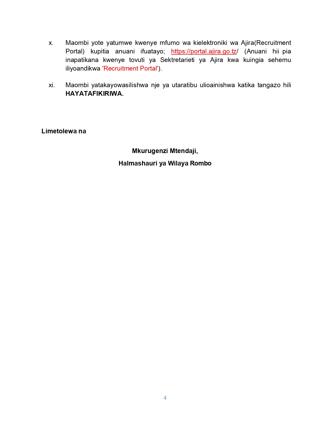 Mkurugenzi Wilaya ya Rombo Atangaza Nafasi za Kazi