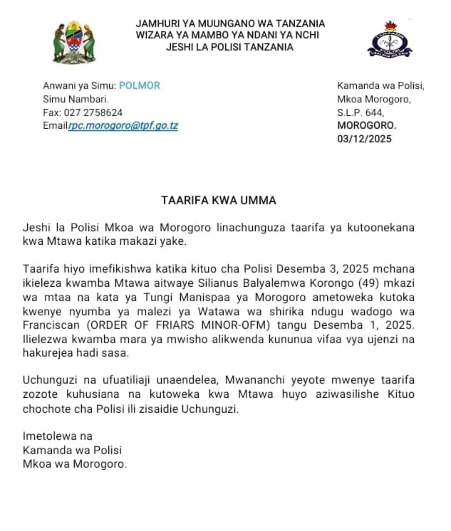 Jeshi la Polisi Mkoa wa Morogoro limesema linafuatilia taarifa za kutoweka kwa Mtawa aliyetambulika kwa jina la Silianus Korongo (49) Mkazi wa Mtaa na Kata ya Tungi, Manispaa ya Morogoro, ambaye ametoweka katika nyumba ya malezi ya Watawa wa Shirika la Ndugu Wadogo wa Franciscan (ORDER OF FRIARS MINOR -OFM ) tangu Disemba 1, 2025.