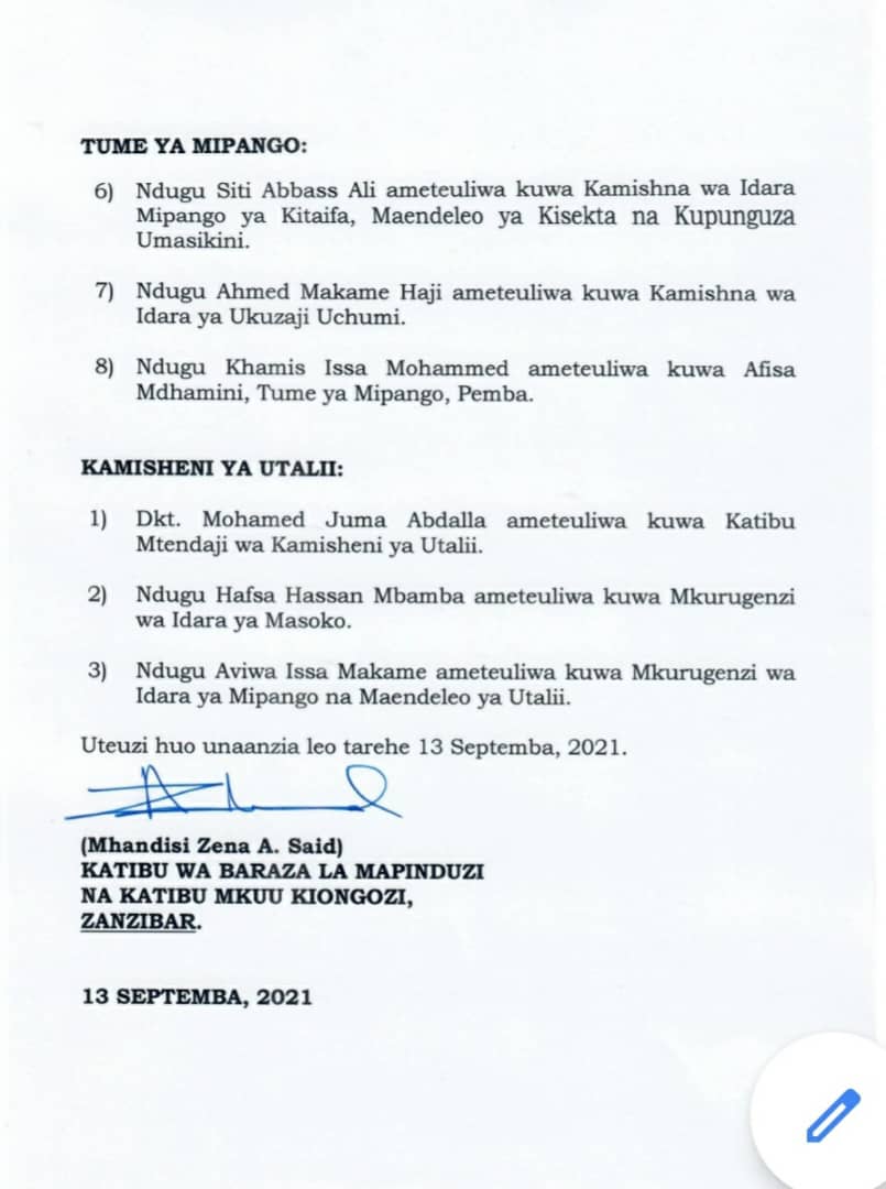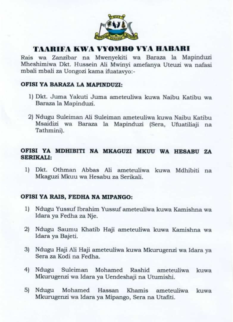 HabariKitaifa Rais Mwinyi Atumbua na Kuteua Wapya Last updated Sep 13, 2021 0 Share Rais wa Zanzibar Dkt Hussein Mwinyi amefanya Uteuzi wa Nafasi Mbalimbali za Uongozi kama ifuatavyo:- Related mwinyi 0 Share