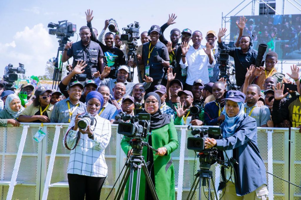 Mgombea wa nafasi ya Rais wa Jamhuri ya Muungano wa Tanzania na Mwenyekiti wa Chama cha Mapinduzi (CCM) Taifa Ndugu Dkt. Samia Suluhu Hassan akiwa kwenye picha ya pamoja na Waandishi wa Habari mara baada ya kufunga Kampeni za CCM katika uwanja wa CCM Kirumba tarehe 28 Oktoba, 2025.