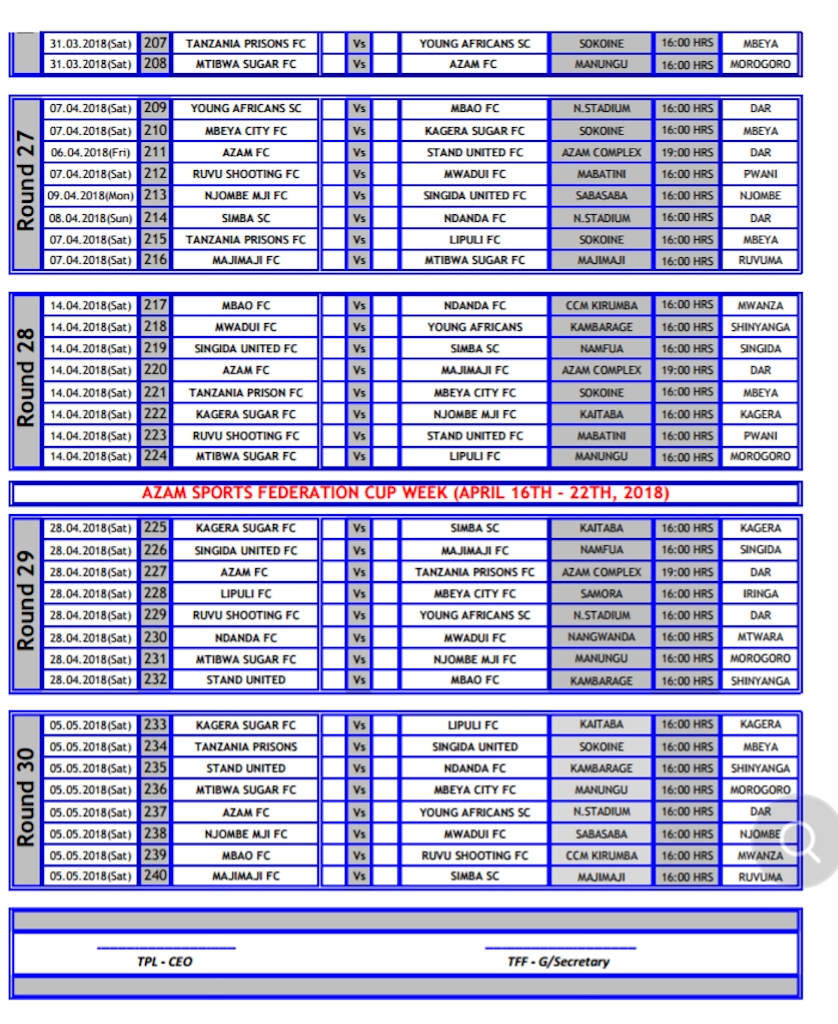 RATIBA LIGI KUU BARA 2017/18