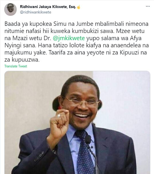 “Baada ya kupokea Simu na Jumbe mbalimbali nimeona nitumie nafasi hii kuweka kumbukizi sawa. Mzee wetu na Mzazi wetu Dkt. Jakaya Mrisho Kikwete yupo salama wa Afya Nyingi sana. Hana tatizo lolote kiafya na anaendelea na majukumu yake. Taarifa za aina yeyote ni za Kipuuzi na za kupuuzwa.”