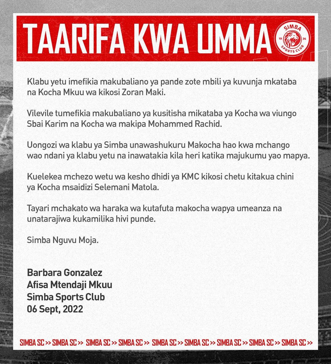 KLABU ya soka ya Simba imetangaza rasmi kuachana na Kocha wake Mkuu Zoran Maki pamoja na wasaidizi wake katika taarifa iliyochapishwa kwenye mtandao wa kijamii wa Instagram wa Klabu hiyo.