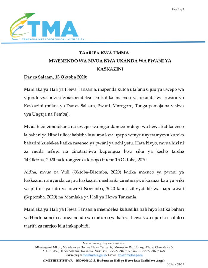 Mamlaka ya Hali ya Hewa Tanzania, inapenda kutoa ufafanuzi juu ya uwepo wa vipindi vya mvua zinazoendelea leo katika maeneo ya ukanda wa pwani ya Kaskazini (mikoa ya Dar es Salaam, Pwani, Morogoro, Tanga pamoja na visiwa vya Unguja na Pemba).