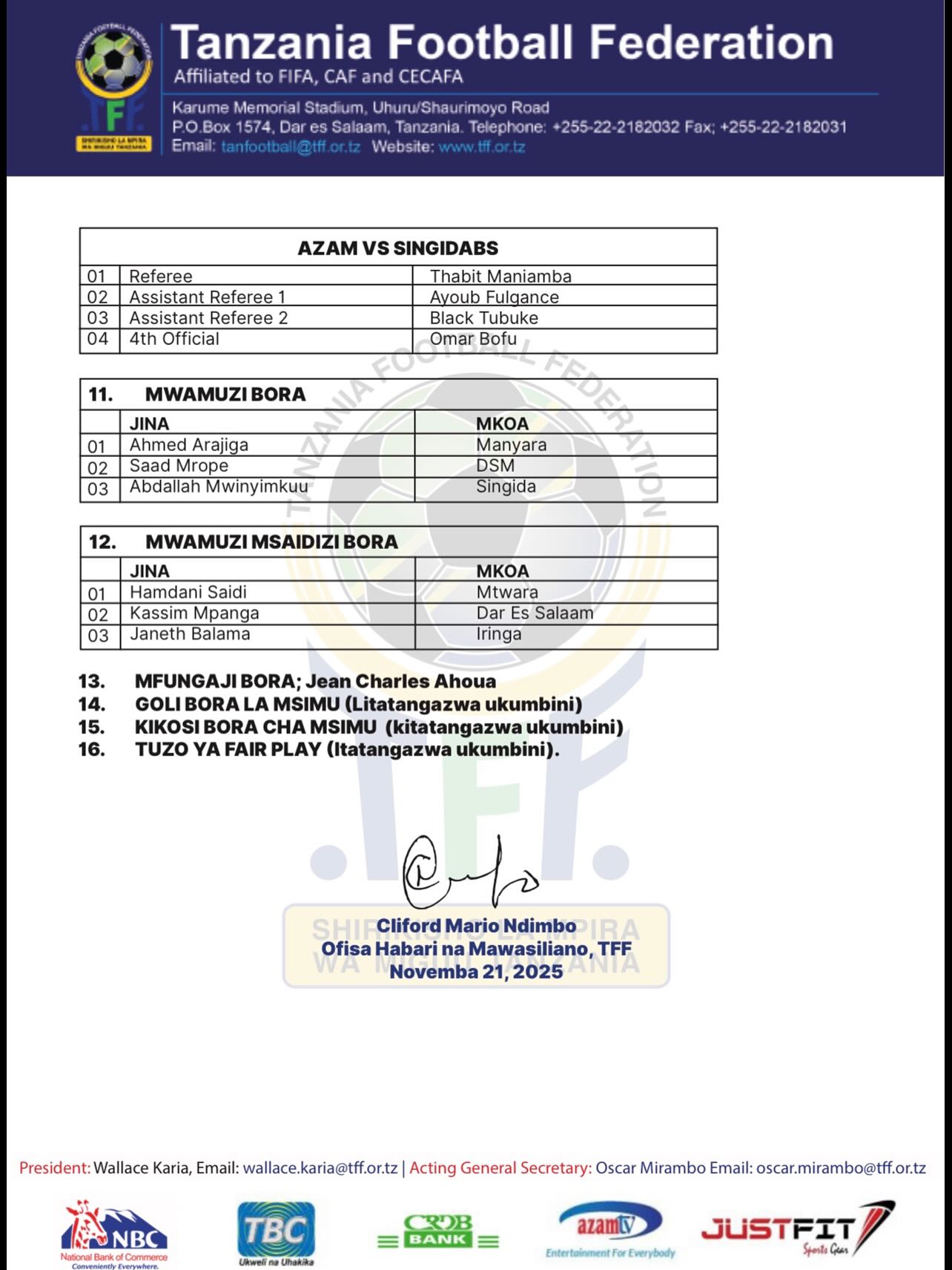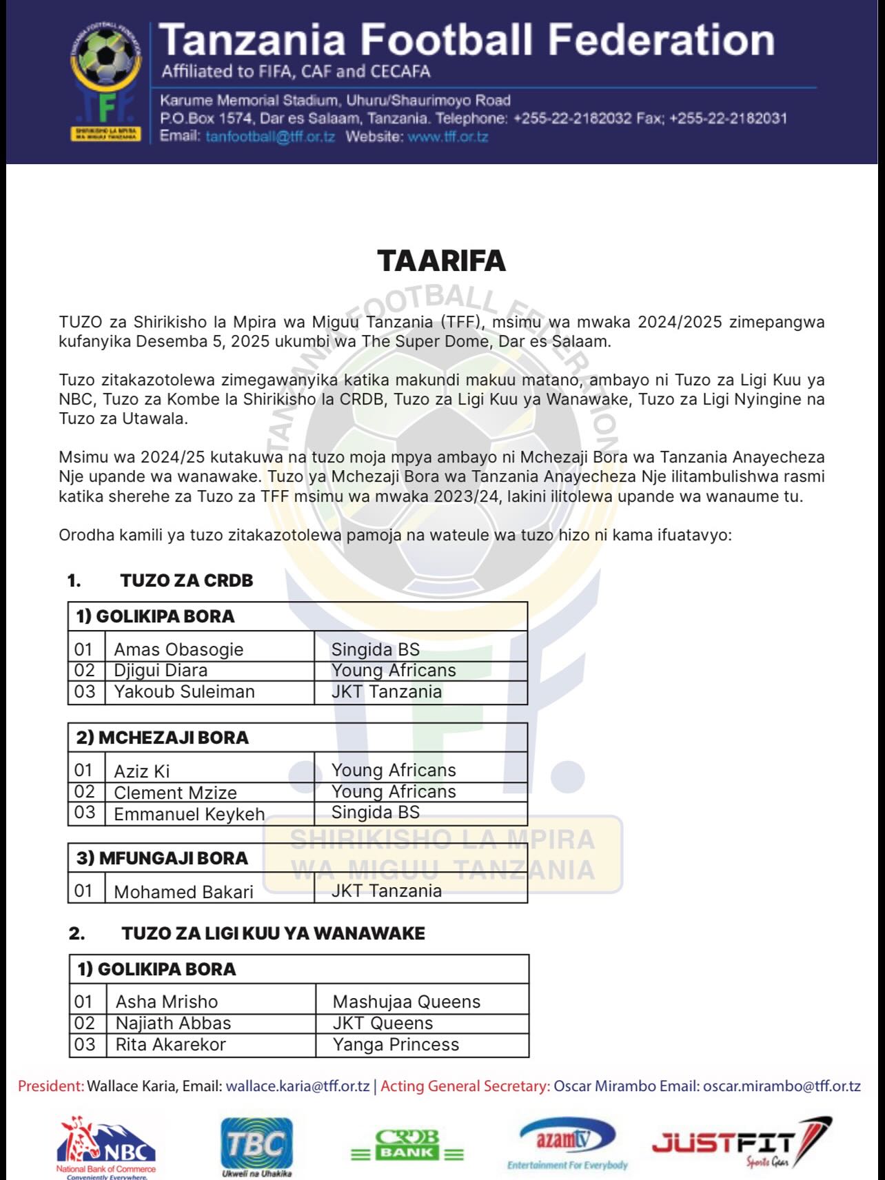 Shirikisho la Mpira wa Miguu Tanzania (TFF) limefahamisha wanaowania Tuzo za Msimu wa Ligi Kuu 2024/2025, huku tukitarajia watakaoibuka washindi rasmi Desemba 5, 2025 katika ukumbi wa The Super Dome, Dar es Salaam.