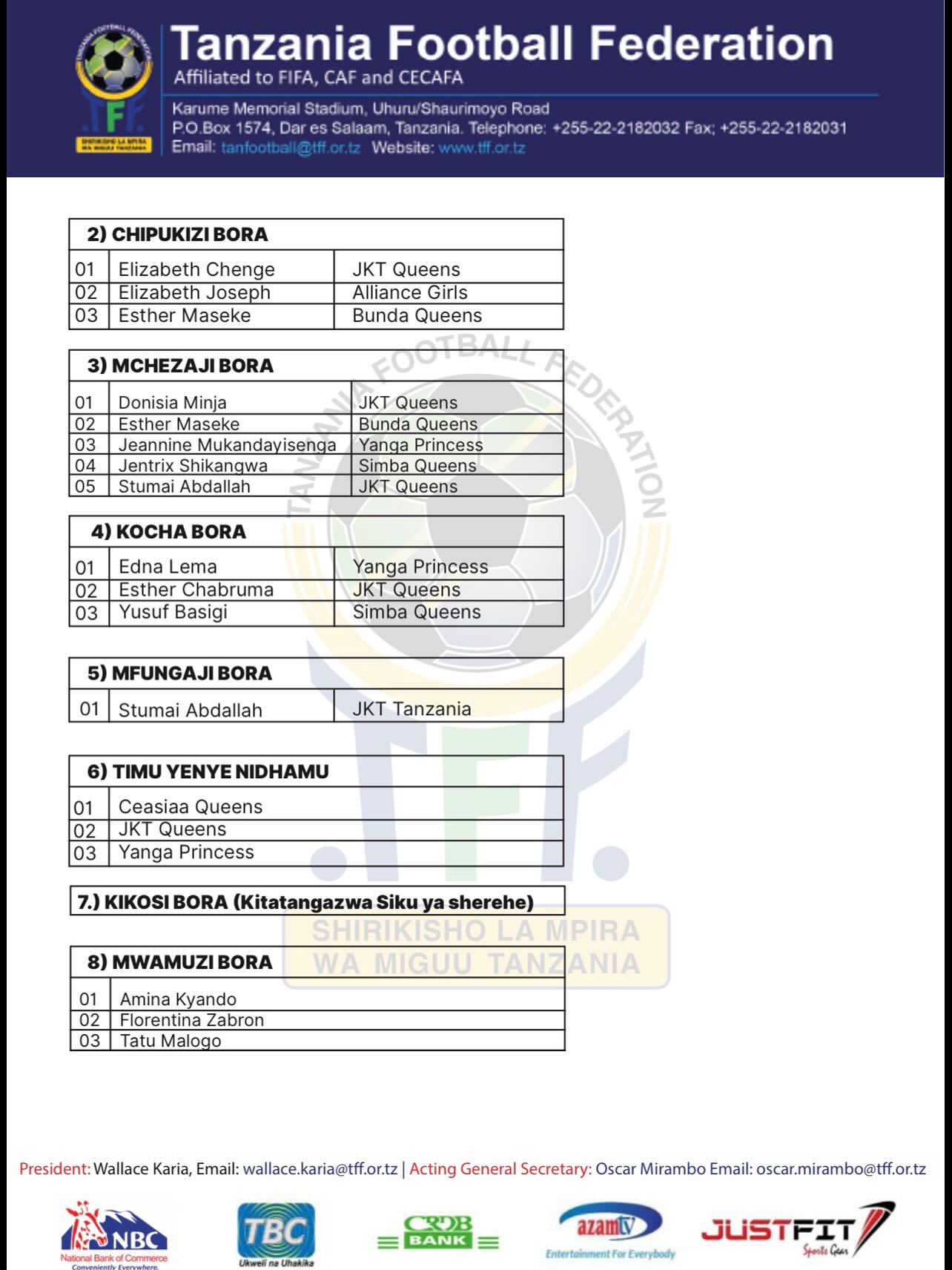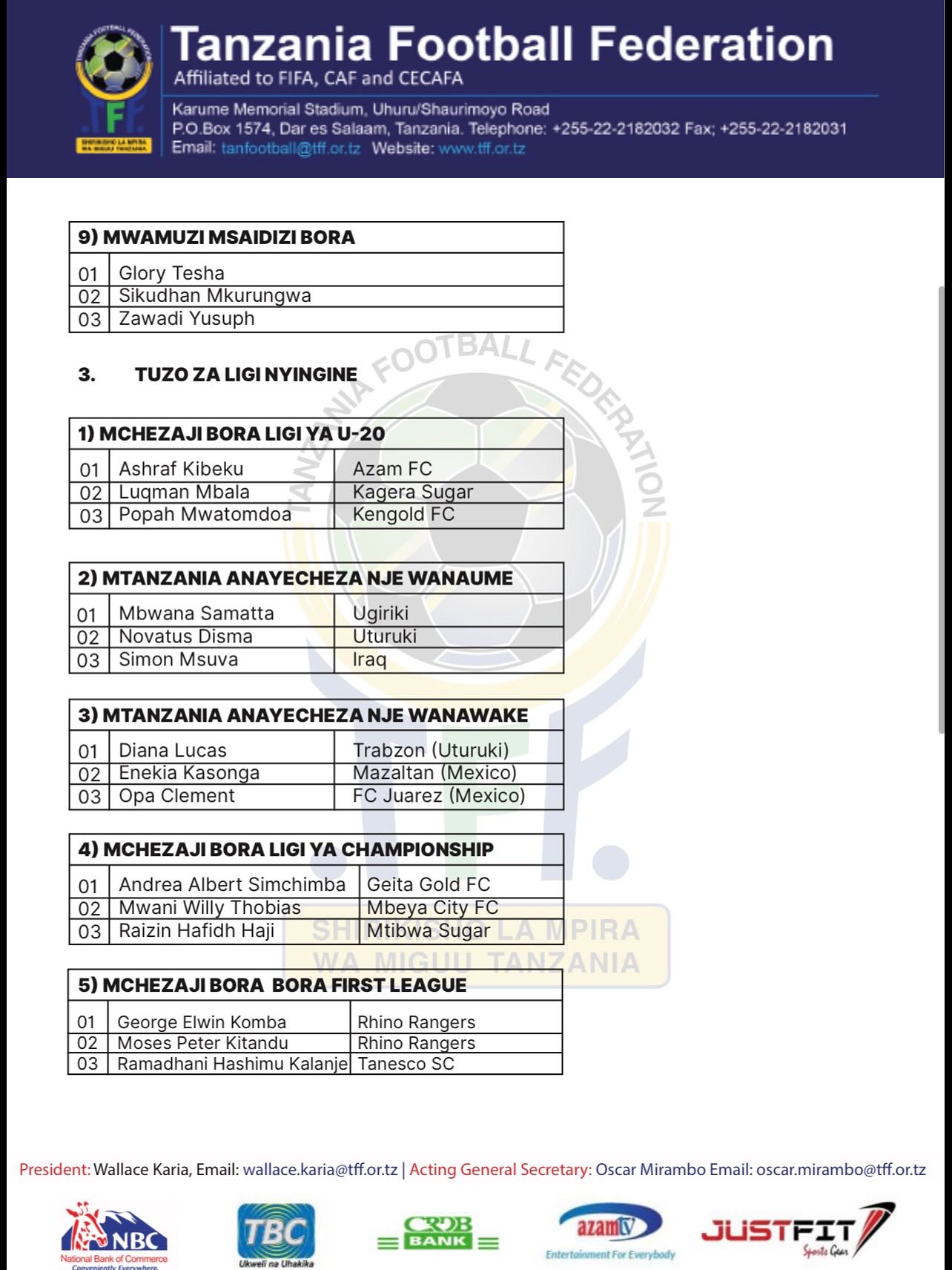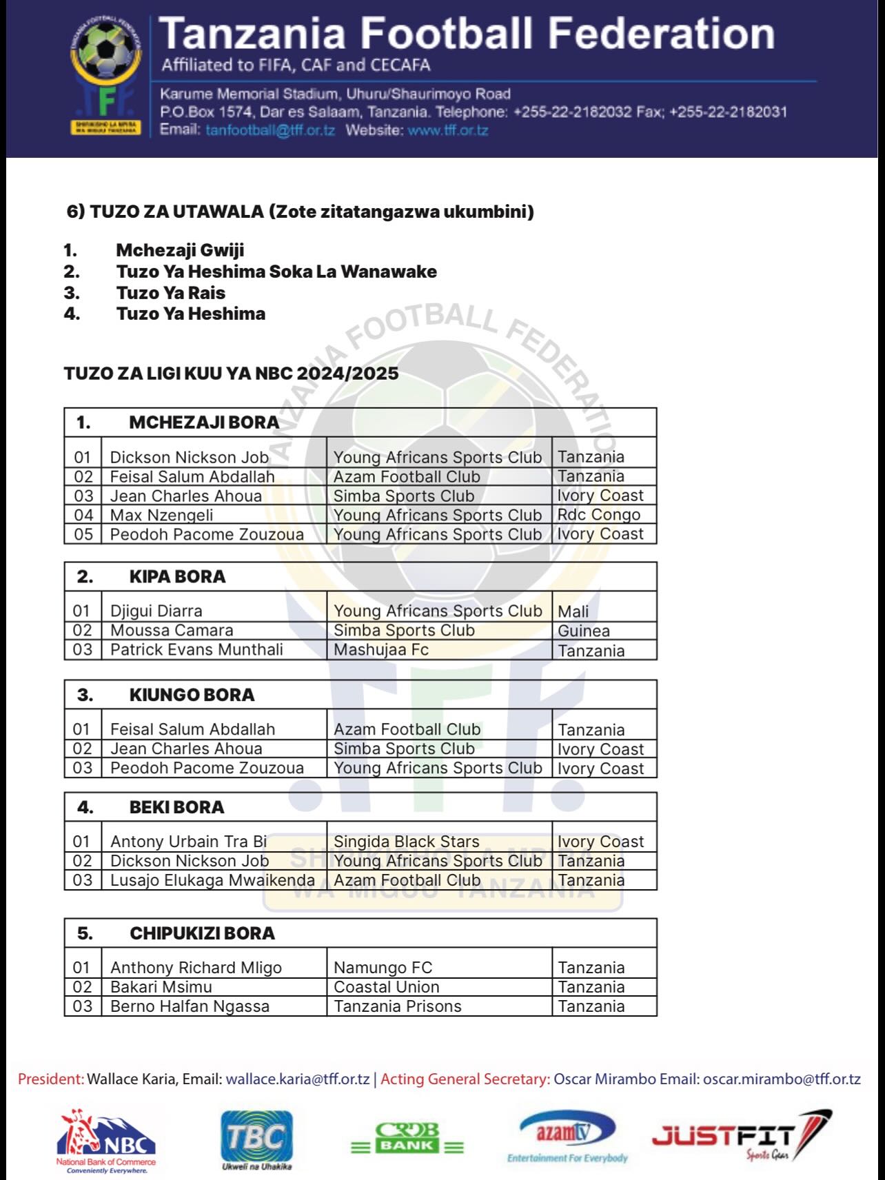 Wanaowania Tuzo za TFF 2024/25 Wapo Hapa… Kutolewa Desemba 5,The Super Dome, Dar